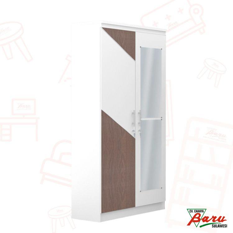 Bahan : Partikel Board, PaperWarna : Dark Brown, WhiteUkuran : 80x43x180,9cmBerat : 44KgKeunggulan :+ Dilengkapi laci pada bagian dalam+ Dilengkapi dengan handle besi + kunci+ Gantungan besi chrome+ Terdapat cermin full body
