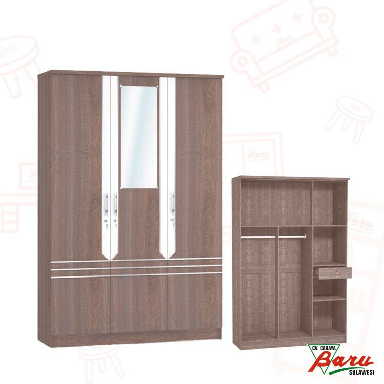 Bahan : Partikel Board, PaperWarna : Dark Brown, WhiteUkuran : 120x43x180,9cmBerat : 60KgKeunggulan :+ Dilengkapi laci pada bagian dalam+ Dilengkapi dengan handle besi + kunci+ Gantungan besi chrome+ Terdapat cermin