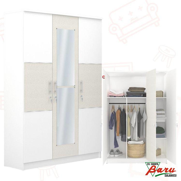 Bahan : Partikel Board, Paper (3D Tekstur)Warna : Beige, WhiteUkuran : 120x43x180,9cmBerat : 60KgKeunggulan :+ Dilengkapi laci pada bagian dalam+ Dilengkapi dengan handle besi + kunci+ Gantungan besi chrome+ Terdapat cermin full body