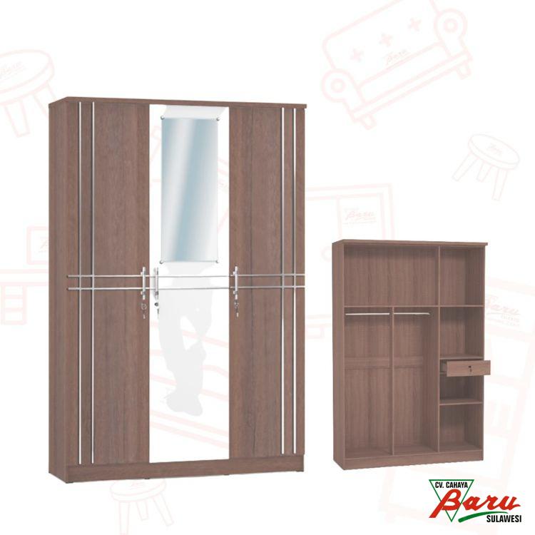 Bahan : Partikel Board, PaperWarna : Dark Brown, WhiteUkuran : 120x43x180,9cmBerat : 60KgKeunggulan :+ Dilengkapi laci pada bagian dalam+ Dilengkapi dengan handle besi + kunci+ Gantungan besi chrome+ Terdapat cermin full body