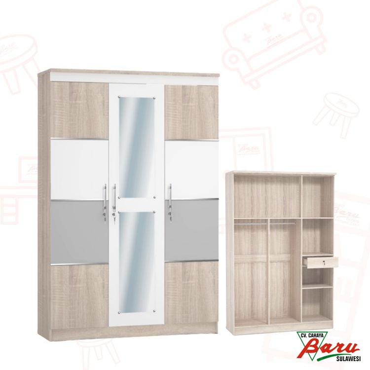 Bahan : Partikel Board, PaperWarna : Cream, White, SilverUkuran : 120x43x180,9cmBerat : 60KgKeunggulan :+ Dilengkapi laci pada bagian dalam+ Handle besi + kunci+ Gantungan besi chrome+ Terdapat 2 cermin